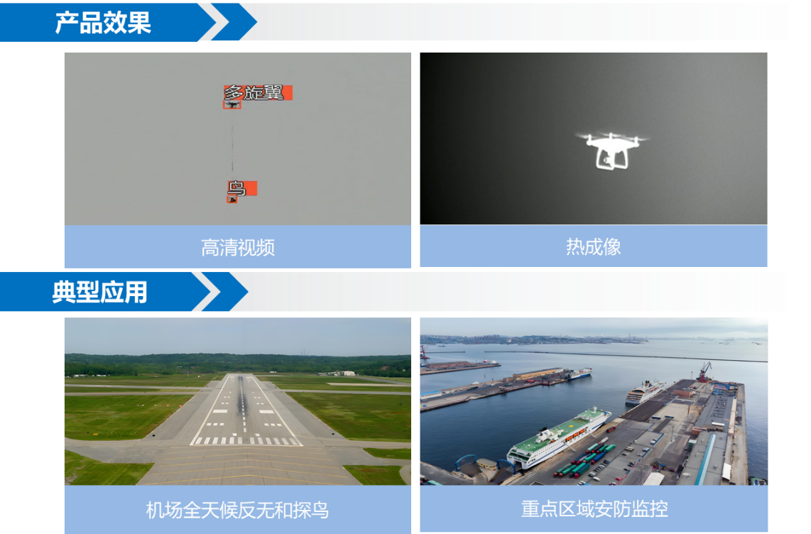 集成了高清視頻和熱成像,在雷達(dá)引導(dǎo)下,配合智能目標(biāo)檢測、跟蹤模塊,可對民用消費(fèi)級旋翼、固定翼無人機(jī)、飛鳥等空中目標(biāo),及地面人員和車輛進(jìn)行有效地探測、跟蹤、識別和預(yù)警,組成低空或地面防御感知系統(tǒng)。全天候、全天時(shí)、全方位有效保障機(jī)場、港口、會(huì)議中心、核化工設(shè)施等重點(diǎn)場所的低空和地面安全。